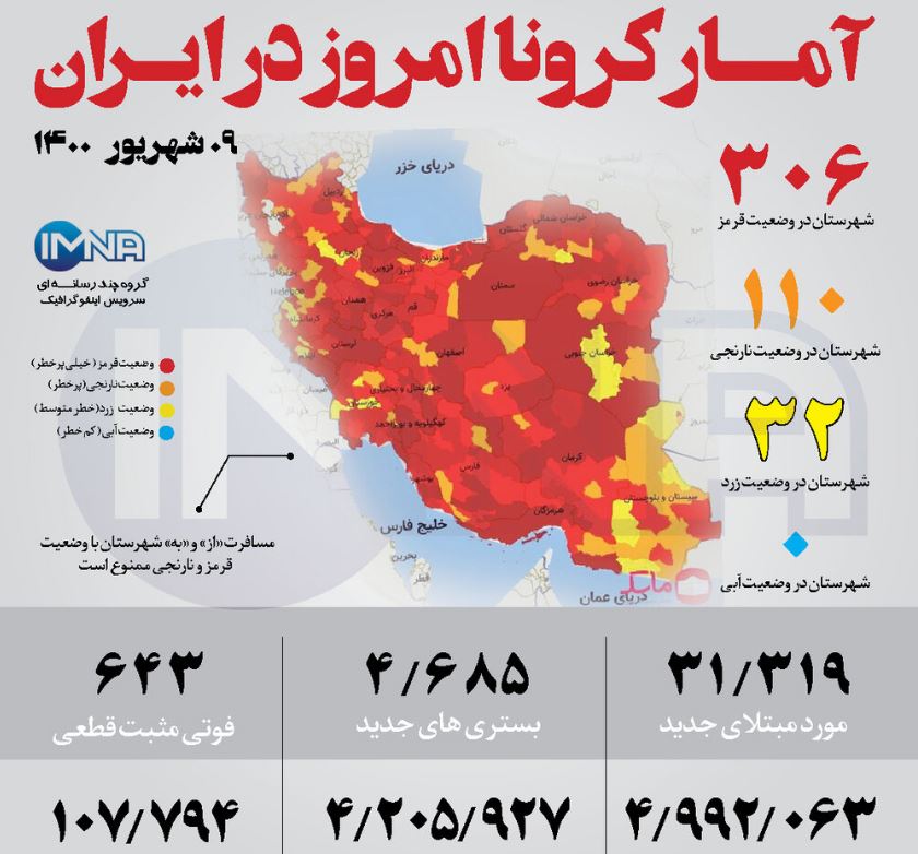 شمار دچارشدگان، جانباختگان و بهبودیافتگانِ کرونا در ایران در ۲۴ساعت گذشته اعلام شد. از دیروز (دوشنبه) تا امروز سهشنبه (نهم شهریور ۱۴۰۰) و بر پایهی معیارهای قطعی تشخیصی، ۳۱هزار و ۳۱۹ بیمار نومبتلا به کووید ـ ۱۹ در کشور شناسایی شد، که ۴هزار و ۶۸۵ تن از آنها بستری شدند. ۶۴۳ بیمار کرونایی طی ۲۴ ساعت گذشته جان خود را از دست دادند و شمار جانباختگان این بیماری طی ۱۹ ماه گذشته در کشور به ۱۰۷هزار و ۷۹۴ تن رسید. بر پایهی آخرین نقشهی رنگبندی کرونایی در کشور، ۳۰۶ شهرستان در وضعیت قرمز، ۱۱۰ شهرستان در وضعیت نارنجی و ۳۲ شهرستان در وضعیت زرد هستند. برای بزرگنمایی، روی تصویر کلیک کنید.برای بزرگنمایی، روی تصویر کلیک کنید.