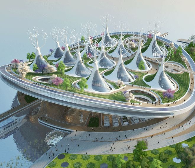 بهتازگی «وینسنت کالبو»، معمار بلژیکی در یک مسابقهی فرامرزی با مدیریت شهری سئول شرکت و طرحی شناور و پایدار ارائه کرد. فرم کلی پروژه از هندسهی هذلولی پیروی میکند و شامل سه بخش اصلی است. هدف اصلی این پروژه، پایداری آن بوده است؛ به طوری که این ترمینال صد در صد انرژی مورد نیاز را خودش تامین می کند به این صورت که 3500 مترمربع از لبه ی پشت بام با پانل های فتولتائیک مات پوشیده شده و توربین های بادی در محور عمودی انرژی قابل ملاحظه ای را فراهم می آورند. همچنین زباله های آلی و زیست تخریب پذیر، برای ایجاد انرژی بیشتر به کارخانه منتقل می شود. در عین حال ساختار لانه زنبوری CLT از درختان جنگل های محلی تهیه می شود. گفتنی است که طراح در این جا به دنبال ترویج کشاورزی شهری، جنگل زراعی و کاهش آسیب به محیط زیست طبیعی بوده است. برای دیدنِ تصویر متحرک، روی آن کلیک کنید :