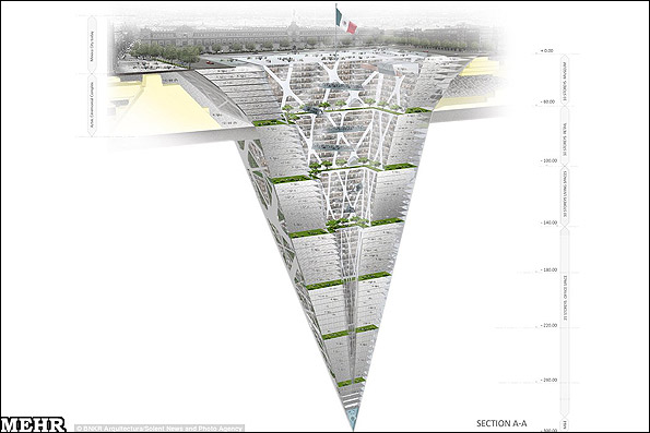 به گزارش خبرگزاری مهر، این هرم واژگون در مرکز مکزیک سیتی از این رو به صورت وارونه طراحی شده تا بتواند با محدودیت ارتفاع در ساخت ساختمانها در این بخش از مکزیک مقابله کند. این ساختمان زیرزمینی از 10 طبقه مسکونی و تجاری و 35 طبقه اداری برخوردار است، همچنین به گفته "استبان سورز" هرم واژگون مکزیکو می تواند مرکز فرهنگی جدیدی را در خود بگنجاند. به گفته وی شهر نیازمند دفاتر، زیرساختها و فضاهای مسکونی جدید است اما در حال حاضر فضای خالی برای احداث چنین ساختمانهایی موجود نیست. همچنین تخریب ساختمانهای قدیمی غیرقانونی است و حتی در صورت وجود فضای کافی، امکان ساخت ساختمانی بلندتر از هشت طبقه در این شهر وجود ندارد. از این رو تنها راه باقی مانده برای ساخت مرکزی فرهنگی، مسکونی، تاریخی رفتن به زیر زمین و ساخت یک "زمین خراش" است، چنین ساختاری می تواند حضور نمادین میدان شهر و سلسله مراتب ساختمانهای موجود در اطراف آن را حفظ کند. این ساختار به گفته معماران هرمی واژگون با فضایی مرکزی تماما شیشه ای است تا ساکنان آن بتوانند از فضاهای موجود در این هرم برای دسترسی به نور طبیعی و سیستم تهویه هوای مطبوع استفاده کنند. همچنین این هرم می تواند مکانی برای برگزاری انواع فعالیتهای فرهنگی-اجتماعی از قبیل برگزاری کنسرتها، نمایشگاه های باز و رژه های نظامی است. هرمها در تاریخ معماری مکزیک نقش حیاتی دارند و تمدنهای باستانی در این منطقه معمولا ساختارهای هرمی عظیمی بنا می کرده اند. زمانی که آزتکها برای اولین بار به دره مکزیک آمدند هرمهایی را در میان یک دریاچه بنا کردند. با رشد و توسعه پادشاهی آزتکها ابعاد این هرمها نیز رشد کرد و آزتکها هرمهای جدید را بر روی هرمهای قدیمی می ساختند. از این رو هرمهای باستانی ترکیبی از لایه های دوره های مختلف تاریخی مکزیک است: