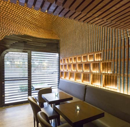 بازسازی مغازه کارت فروشی و تبدیل آن به کافی شاپ با متراژ ۲۸ متر مربع چالشی برای شروع این پروژه بود . این کافی شاپ در خیابان استاد نجات الهی، رو به روی ساختمان سازمان صنایع دستی ایران واقع گردیده است. با توجه به کوچکی فضا و موقعیت مکانی پروژه که مرکز فروش صنایع دستی در تهران می باشد، با چالشی رو به رو بودیم که بتوانیم ایده ای را برای طراحی ایجاد کنیم که اولاًجوابی برای کوچکی فضا و همچنین ایجاد هماهنگی با بافت شهری پروژه نماید و در کنار این بتواند کیفیتی از صنایع دستی ایرانی در فضای داخلی پروژه به وجود آورد. بر اساس این مشخصات ما سعی کردیم همراه با پرداختن به دیاگرام فضایی پروژه ایده متریالی طرح را به گونه ای طراحی کنیم که از بیرون به درون پروژه یک ایده یکپارچه دیده شود . با توجه به آنکه این بنا رو به روی ساختمان مرکزی صنایع دستی که یک ساختمان آجری است قرار گرفته ، از مصالح آجر برای شکل دهی فضا استفاده کردیم ولی با توجه به کوچک بودن فضا آجر را به ابعاد ریزتر تبدیل نمودیم، به گونه ای که ما یک آجر کامل 20*10*5 را به هشت قطعه 5*5*5 تبدیل نمودیم و سپس دو سانتی متر از یک وجه آن را لعاب دادیم. بنابراین متریال پروژه بر اساس این مدل آجر شکل گرفت. که از نظر بهداشتی نیز جوابگوی نظافت دیوارهای کافه بود. (terracottaبا لایه ی ضد باکتری روی آن ) در شکل گیری دیاگرام سه بعدی طرح در ابتدا با یک سقف کوتاه با ارتفاع مفید حدود ۲ متر و با یک نیم طبقه کوتاه تر در حدود ارتفاع ۱.۹ متر مواجه بودیم. با توجه به وضعیت بنا دیاگرام فضایی طرح می بایست مشکلات وضع موجود بنا را حل می نمود. در قدم اول تصمیم گرفتیم نیمی از نیم طبقه مغازه را تخریب کرده تا ارتفاع آن از سطح همکف بلندتر گردد و سپس آشپزخانه کافی شاپ به همراه سرویس بهداشتی را در طبقه بالا قرار دادیم که از طریق یک پله و یک بالابر با فضای پایین در ارتباط باشد. مساله بعدی ایجاد یک هواکش قوی برای آشپزخانه بود که در دیاگرام فضایی طرح دیده شود. با توجه به اینکه نمی خواستیم هواکش صنعتی آشپزخانه در نمای کافه خودنمایی کند و علاوه بر آن با آشپزخانه در ارتباط باشد ، دیاگرام سه بعدی طرح را به گونه ای دیدیم که از بیرون به درون کشیده شود و ارتباط بین آشپزخانه ، حجم پایین و حجم بیرون را به طور همزمان ایجاد نماید. در عین حال تهویه صنعتی آشپزخانه نیز در طرح مستتر گردید. نورپردازی اصلی فضا نیز از طریق طراحی چراغ هایی که ما بین بندهای آجرها قرارگرفته است تامین می شود که الهام گرفته شده از فخرومدینهای آجری در بناهای سنتی ایرانی می باشد. متریال دیگری که در پروژه وجود دارد، متریال چوب تیره است. که بخش کف سالن، مبلها، میزها و بخش مرتبط با آشپزخانه را شکل داده است . نوآوری و مزایای پروژه : ۱- یکپارچگی کل و جز در دیوارها ، سقف ، نورپردازی بیرون و درون طرح با یک متریال سنتی که معرف هویت معماری ایرانی است ۲- سعی در ایجاد ارتباط این مغازه با بافت شهری خود که "مرکز صنایع دستی ایران" می باشد ۳- استفاده از لعاب سنتی با بیانی که بتواند در فضای محدود ایجاد ترکیب رنگ و نور متفاوت نماید ۴- استفاده از نورپردازی مصنوعی در فضا با ادغام در هندسه آجرچینی ۵- پرهیز از بکارگیری متریال های گوناگون در فضای پروژه و ایجاد یک هویت یکپارچه ۶- حل مسائل مختلف پروژه از طریق یک دیاگرام کلی سه بعدی که کل فضا و هندسه آجرچینی فضا را نیز تعریف نموده است ۷- حل کردن تاسیسات فضا در میان لایه های پروژه به گونه ای که تاسیسات در حالت حداقل خودنمایی کند ۸- رسیدن به راه حل های ساخت و سازی ساده با توجه به پیچیدگی هندسه آجرچینی طرح